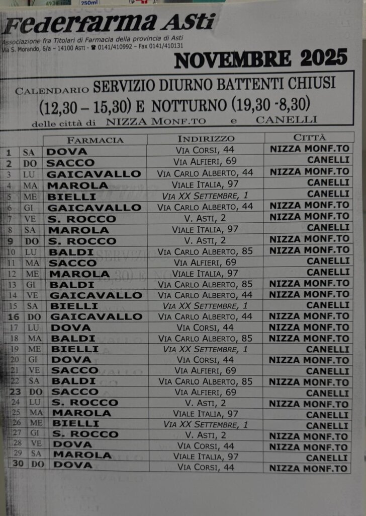 Qui troverete informazioni dettagliate sulle farmacie di turno, sia per il servizio diurno a battenti chiusi (12:30 – 15:30) che per il servizio notturno (19:30 – 08:30), nelle città di Nizza Monferrato e Canelli.